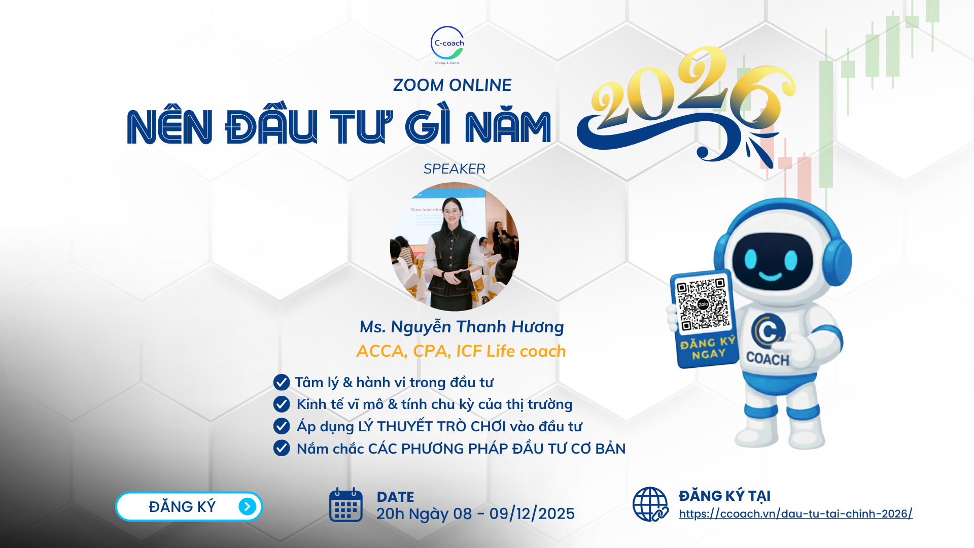 Nguyễn Thanh Hương là Founder của C-coach với hơn 13 năm kinh nghiệm trong lĩnh vực tư vấn, kiểm toán, quản trị tài chính và dự án tại các doanh nghiệp lớn. Với nền tảng tài chính vững và kinh nghiệm thực tế khi khởi nghiệp 2 doanh nghiệp và chuỗi café, Hương mang đến góc nhìn ứng dụng, thực chiến và cân bằng giữa tư duy – sức khỏe – tài chính.